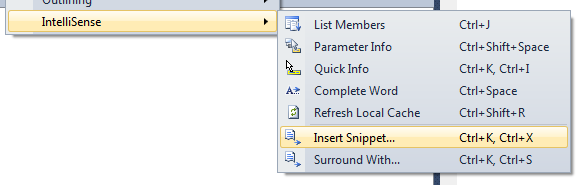 In contrast to Insert (Expansion) snippets the Surround with snippets take all the selected text and surround it by the code contained in the snippet. Surround with snippets are again accessible using the menu or Ctrl+K, Ctrl+S default shortcut.
