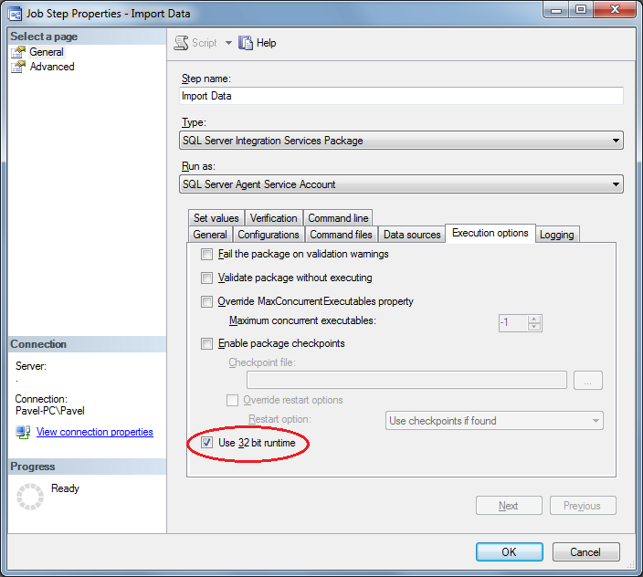On the SQL Server 2008 and newer the solution is easy as the Job Step Properties dialog for a SQL Server Integration Services Package type has an option to execute the package using the 32 bit runtime. The option can be found on the Execution options tab. Once you set the “Use 32 bit runtime”, the SSIS package will run correctly on the x64 version of SQL Server 2008 and above. The option simply set the /X86 argument of the DTExec utility and you can see it on the Command Line tab, once you check it.