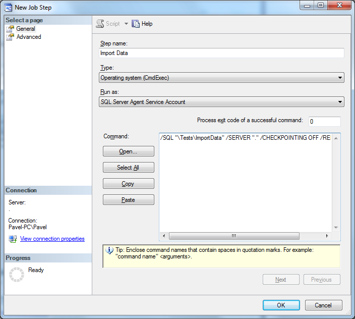 After setting all the necessary parameters, change the step Type to Operating System (CmdExec). All the arguments for the DTExec appear in the command TextBox.
