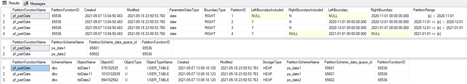 Also it informs, that there are two partitions schemes. Partition scheme [ps_date1] which is used by tables [dbo].[tblDate1] and [dbo].[tblDate11] and partition scheme [ps_date2] which is used by table [dbo].[tblDate2].